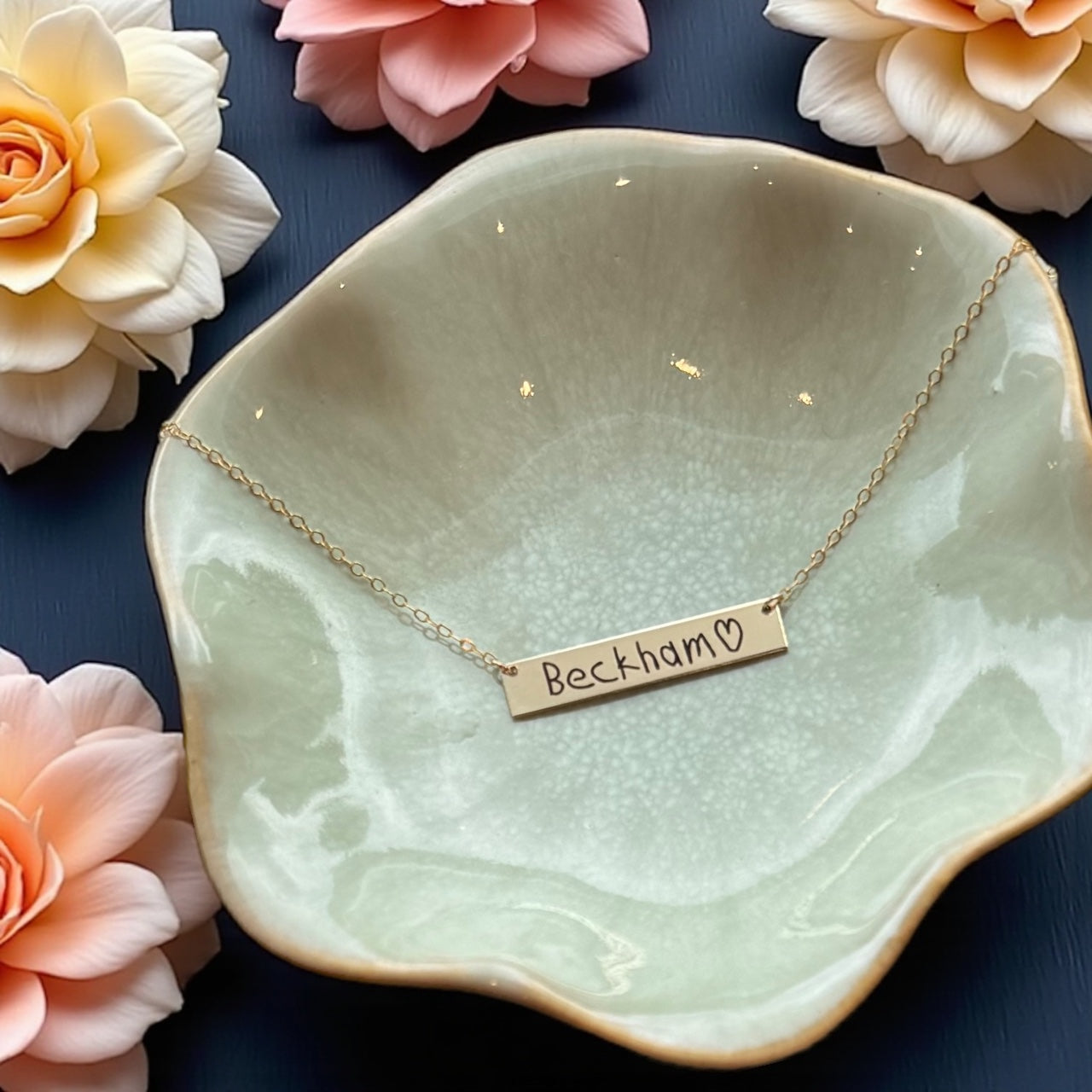 Absolutely stunning and my favorite piece of jewelry. It is so beautiful,The Carrick Bend team took the time before making my order to show me a replica of what it would look like. They also showed me other possible ideas we could possibly do like handstamps (which is a deeper engravement). It meant so much to me that they did that before the order to make sure I’d like it. I put the two names of my precious furbabies on it plus a paw print. I truly love it and it was shipped out quickly after the order was placed! It’s seriously so beautiful and my babies mean everything to me so I’ve always wanted a personalized necklace with their names on it. I recommend this company whole heartedly.